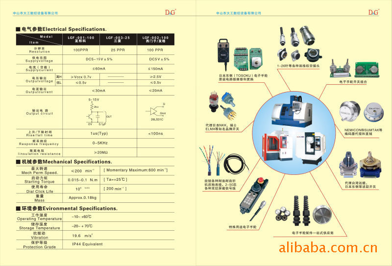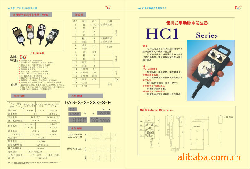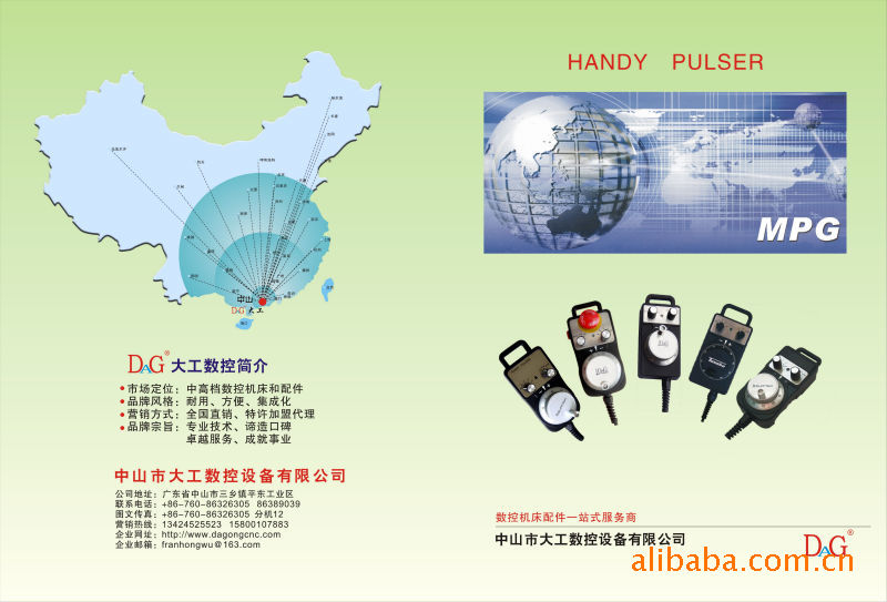 中山市大工机电设备有限公司成立于2002年,是一家数控机床和行业配件的台商合资企业,目前投放市场的产品主要有数控机床(加工中心,雕铣机,深孔钻,高速钻孔攻牙铣一体机,数控车床等);DAG系列工业冷却设备(主轴油冷机,水冷机);空气干燥净化设备(空气干燥机);数控机床配件电子手轮和手轮配件如编码器、波段开关、数字式波段开关、弹簧线及数控I/O线缆等,其中电子手轮可适用于发那科、西门子、三菱、发格、海德汉、宝元、新代、海那克HANUC、广州数控GSK、开通数控、凯恩帝KND等知名数控系统及符合下列条件范围内的所有数控系统(输出脉波100PPR或25PPR,供电范围在DC5V-24V之间)。大工机电设备有限公司本着“客户第一,诚信至上”的原则与多家企业建立了长期合作关系,热诚欢迎各界朋友前来参观,考察,洽谈业务。详情请登http://www.dagongcnc.com或http://dagongcnc.cn.alibaba.com查阅。地址:广东省中山市三乡镇平南市场侧C座20号首层,电话:0760-86326305,86389039,营销热线:13424525523,13925356187传真:0760-86326305分机12邮箱:franhongwu@163.com dagongcnc@163.com