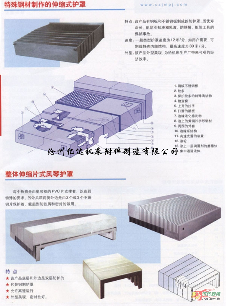 他是用来保护机床的,保护机床的表面不受外界的腐蚀和破坏,有风琴式、钢板式、这两种是导轨上用的;还有丝杠上用的丝杠护罩(圆形、方形、多边形)这几种的做法不同,有用钢丝支撑式的,还有缝合式的。还有卷帘式护罩、盔甲式护罩。