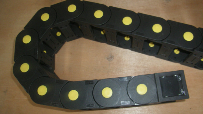 ★工程拖链知识:工程拖链,它适用于数控机床、加工中心、自动化机械及生产线等各类机床、机器人、运输机械、测量仪器、搬运装置以及其它驱动控制作为电线、电缆液、气软管的防护装置,能随机床、机械设备移动部件协调地运行,可发挥安全保护和导向的能力,可延长被保护的电线、电缆、液、气软管的使用寿命,降低消耗,可大大改善机床、机械设备的电线、电缆、液、气软管分布零乱的状况,使之整齐、规则地排列在一起,能增强机床、机械设备的整体艺术造型效果。★拖链的结构:拖链外形似坦克链,由众多单元链节组成,链节之间转动自如。相同系列的拖链内高、外高、节距相同,拖链内高、弯曲半径R可有不同的选择。单元链节由左右链板和上下盖板组成,拖链每节都能打开,装拆方便,不必穿线,打开盖板后即可把电缆、油管、气管等放入拖链内。另可提供分隔片,将链内空间按需要分隔开。★工程拖链分类:工程拖链按材质分为塑料工程拖链和钢制工程拖链。按结构分为桥式工程拖链和全封闭式工程拖链。外形美观,重量轻,长度可任意自行调整。