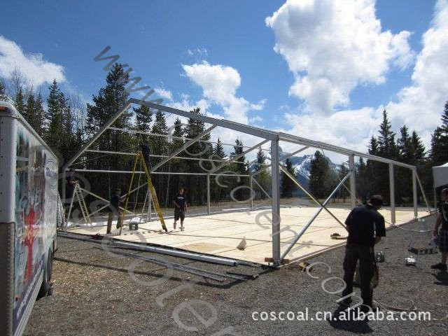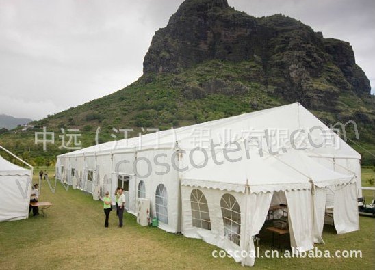 中远篷房采用高强度铝合金及双面PVC纤维布作为主体材料,具有阻燃、防紫外线、防水、防霉、易清洁、易安装、可重复使用等特点,可抗8级风力。