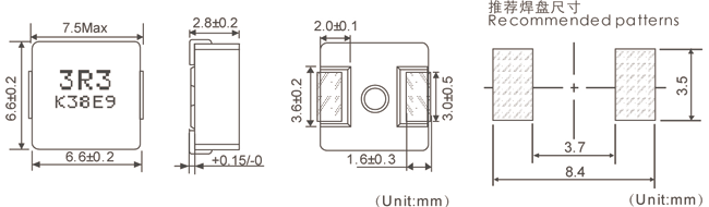 (1) 公司名称:CODACA。 (2) 产品类型:SMD系列。 (3) 产品外形:线圈180度出脚,一体成型磁芯。 (4) 系列类别:B表示B材;C表示C材;E表示E材。 (5) 外观尺寸:07表示宽6.6mm(Ref),30表示高3.0mm(Max)。 (6) 电气特性表示:2R2表示2.2UH。 (7) 允许公差:M表示±20%. (8) 包装方式:R表示载带盘装,P表示吸塑盘装。 | | 外型尺寸(单位:mm) |  | | 电气性能 |
