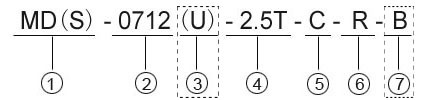 注:虚线框内表示默认值。 ①产品类型:“MD”代表插脚型;“MDS”代表贴片型。 ②外形尺寸:“07”代表宽度为7mm;“12”代表高度为12mm。 ③外观方式:“U”代表裸露式;“S”代表封闭式。 ④线圈圈数:“2.5T”代表2圈半。 ⑤绕制方式:“C”代表密绕;“S”代表疏绕。 ⑥颜 色:“R”代表红色。 ⑦磁芯种类:“A”代表铝芯,“B”代表铜芯,“F”代表铁氧体磁芯,“AR”代表空芯。 | | 外型尺寸(单位:mm) |  | | 电气性能 | | 产品编号 | 颜色 | 最小电感值(nH) | 最大电感值(nH) | 中心电感值(nH) | Q值 | 测试频率(MHz) | | MD0712-1.5TS-B | 白 | 16.8 | 22.6 | 19.7 | 70 | 100 | | MD0712-2.5TS-B | 红 | 23.5 | 36.5 | 30.0 | 70 | 100 | | MD0712-3.5TS-B | 橙 | 30.2 | 51.2 | 40.7 | 70 | 100 | | MD0712-4.5TS-B | 黄 | 42.0 | 60.0 | 51.0 | 45 | 100 | | MD0712-5.5TS-B | 绿 | 56.5 | 89.5 | 73.0 | 60 | 100 | | MD0712-6.5TS-B | 蓝 | 72.6 | 102.4 | 87.5 | 50 | 100 | | MD0712-7.5TS-B | 紫 | 88.4 | 125.6 | 107.0 | 50 | 100 | | 模压线圈的颜色可根据客户要求生产 |