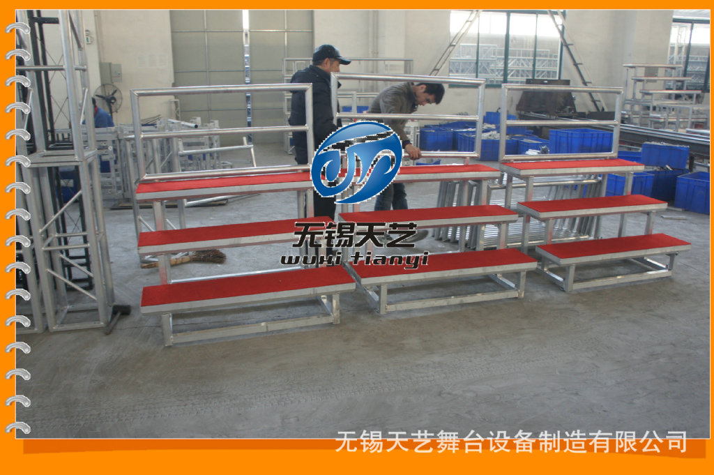 标准合唱台-专业铝合金折叠合唱台,合唱台,合影台,看台,组合看台,多用于人多,集合度较高的场合,例如,合唱,合影等。长宽高可根据客户的需求来订做,需要多少层就可做多少层,结构牢固,价格适中,外观精美,深受消费者的认同。 标准合唱台、 折叠合唱台架适合学校、照相馆等使用,可做简易折叠式看台、折叠唱台、活动唱台、移动唱台、折叠式合唱台、折叠式分组 ,踏步可木板加地毯.贴面木板加包边.铝合金板面,踏步有三层.四层.五层.六层可选,有带脚轮和不带脚轮。单个基本宽度1.2米、1.5米、1.6米,单个最宽为2米,可以多个组合。合唱台的靠栏可拆装.踏步可折叠起来,储藏.运输方便。广泛用于学校、单位、文艺演出、集体照相、少年宫、各大企业事业单位。