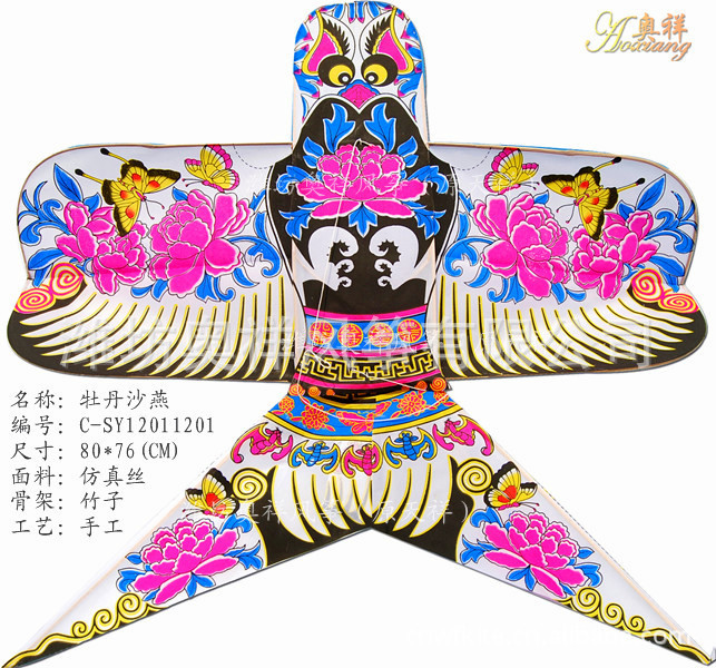 沙燕美女人物风筝属中国传统硬翅风筝,硬翅风筝在传统风筝数量上占有较大的比重,是中国风筝当中最具有代表性。硬翅风筝,特点是升力片(翅)用上下两根横竹条做成翅的形状,两侧边缘高,中间凹,形成通风道。翅的端部向后倾,使风从两翅端部逸出,平着看象元宝形。这种风筝的硬翅是固定的形式,而硬翅范围以外的造型与骨架结构,则随内容题材的不同而变化。