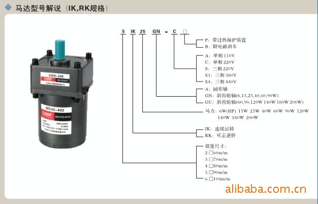 机种 | 功率(w) | 电压(v) | (Hz) | (A) | 起动转矩 (kg.cm) | 额定转矩 (kg.cm) | 额定转速 (rpm) | 额定时间 | 电容 | 6IK140GN-A | 140 | 1φ110 | 50 | 2.6 | 8.5 | 11 | 1350 | 连续 | 24 | 6IK140GN-C | 140 | 1φ220 | 50 | 1.4 | 8.5 | 11 | 1350 | 连续 | 8 | 6IK140GN-C | 140 | 1φ380 | 50 | 0.7 | 25 | 10.8 | 1350 | 连续 | - |