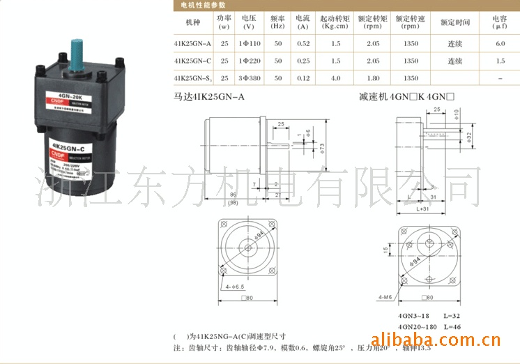 机重 | 功率(w) | 电压(v) | 频率(Hz) | 电流(A) | 起动转矩 (kg.cm) | 额定转矩 (kg.cm) | 额定转速 (rpm) | 额定时间 | 电容 | 4IK25GN-A | 25 | 1φ110 | 50 | 0.52 | 1.5 | 2.05 | 1350 | 连续 | 6.0 | 4IK25GN-C | 25 | 1φ220 | 50 | 0.25 | 1.5 | 2.05 | 1350 | 连续 | 1.5 | 4IK25GN-C | 25 | 3φ380 | 50 | 0.12 | 4.0 | 1.80 | 1350 | 连续 | - |