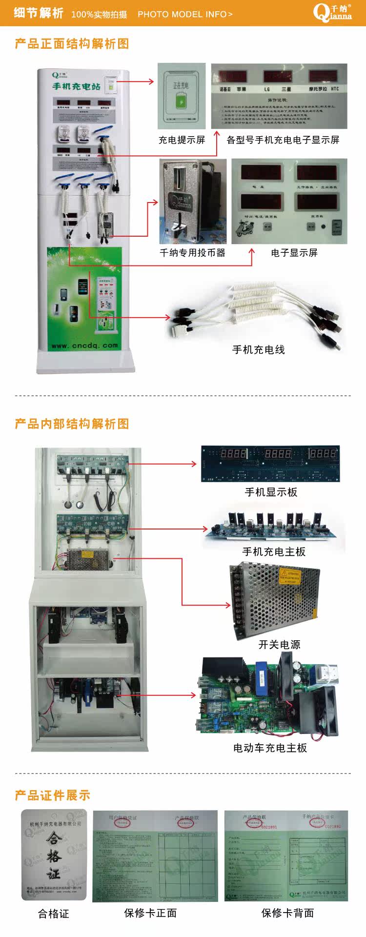 SGDDZ-1型多功能充电站,是杭州千纳充电器有限公司,经过详细市场调研、市场分析,根据广大人民群众需求并结合国家发展政策,研发出的一款集各种厂牌手机和电动车快速充电的自助服务设备。产品性能稳定、结构合理、外观时尚,操作简便,主要应用于报刊亭、商场、超市等公共场所。