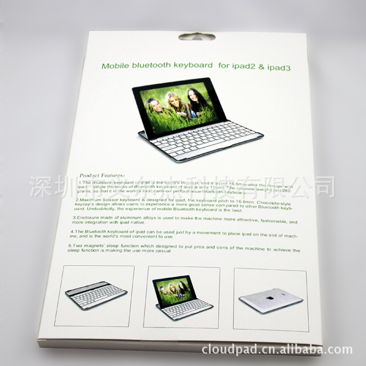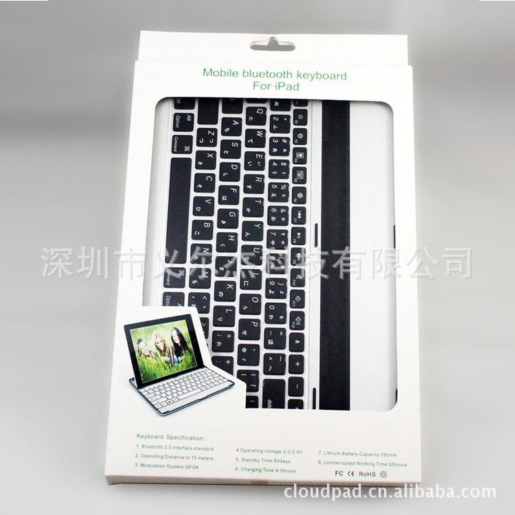 多语言版本如需打样,请联系客服咨询。 产品型号:K82 日文版本 无线蓝牙键盘可用于ipad2和ipad3 1.0产品特征 1.1多功能蓝牙键盘,无线蓝牙连接,连接方便。 1.2适用于IOS系统,可用于ipad2和ipad3。 1.3剪刀角和巧克力键帽,使用时手感更加舒适。 1.4支持智能休眠模式。 1.5内置锂电,可充电反复使用。 1.6拥有智慧时尚兼具的外型,成为您随身携带,四处畅游时不可或缺的最佳良伴。 1.7特殊功能键:音乐控制,音量控制,主页等,易于操作。 1.8铝合金材质高档时尚,体积小携带方便。 键盘规格: 电池锂聚合物 电池容量:160mah 产品规格: 产品尺寸 | 24.5*18.5*1.1cm | 彩盒尺寸 | 31.5*19.5*1.5cm | 外箱尺寸 | 37*24.5*25cm | 产品重量 | 0.37KG | 净重 | 9.25KG | 毛重 | 9.95KG | 数量(pc) | 25件 | 颜色 | 黑 白 | 电量 | 160mah | 工作电流 | 2.5—3.5MA | 睡眠电流 | 200uA | 充电时间 | 3-4小时 | 工作时间 | 25天 |