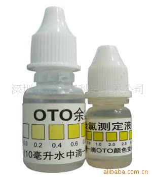 余氯测试:取自来水及碱性小分子水各一份,每10毫升水中加入一滴OTO余氯测试液,对照比色卡即得知水中余氯的含量。说明:净化过的水不得含有余氯。