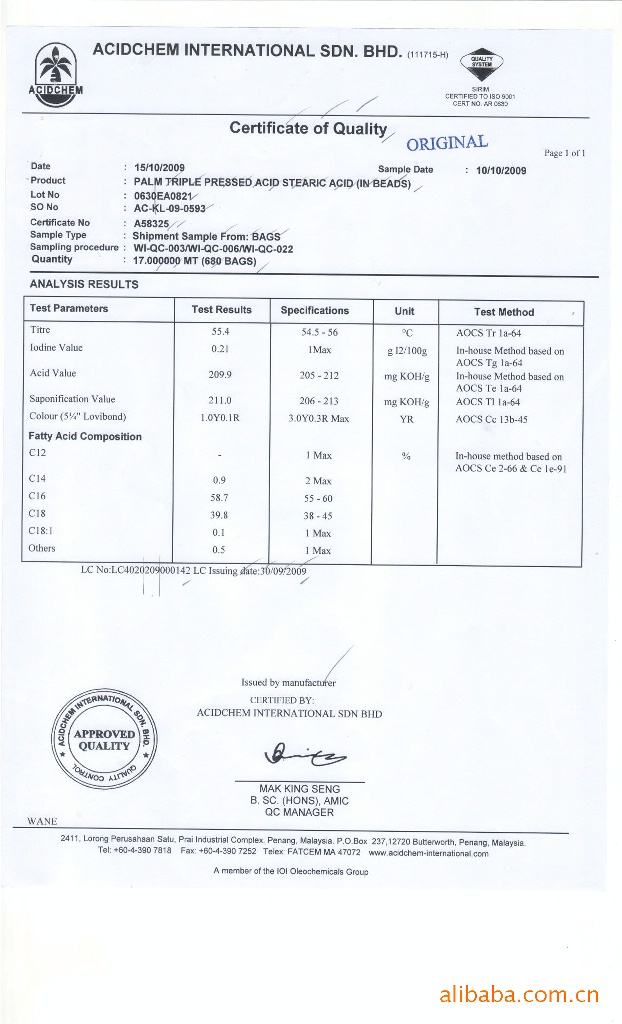进口硬脂酸、月桂酸、甘油(USP99.9%)