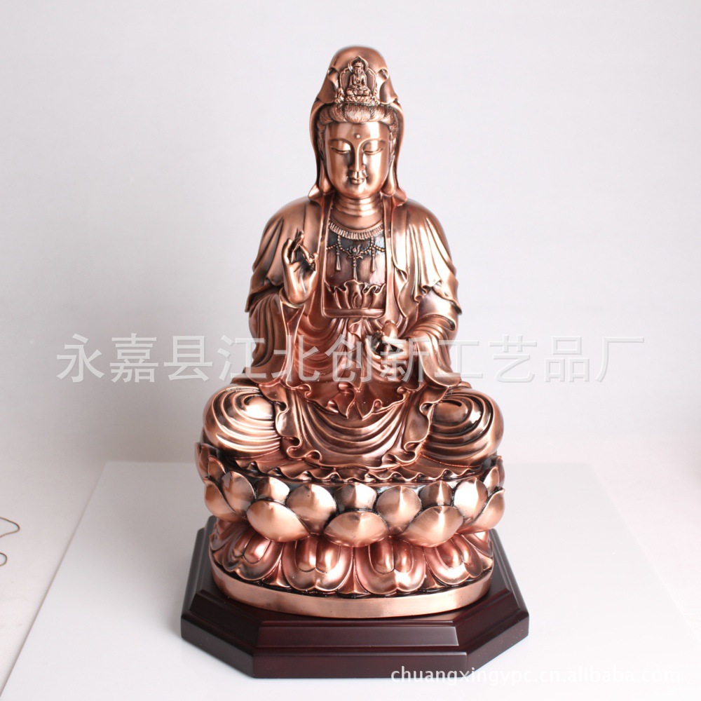 该产品采用进口树脂加石粉经现代科技设备融合后,经注浆压铸,冲压或离心浇注融合成型,胚体再经过磨底,修边,抛光,打沙,脱蜡,上光等几十道工序后,再经电镀古铜,拉丝后后,一件精美大方,高贵典雅,做工精细,形态逼真,物美价廉的观世音菩萨艺术品最终落成。该产品设计造型美观大方,轮廓清晰,色泽柔和,古朴典雅。实乃家庭供奉,家居装饰,办公装饰,招财旺宅,镇宅辟邪,亲友馈赠的最佳选择。