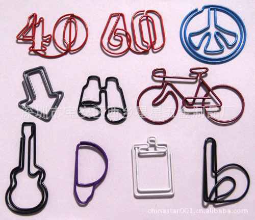 我司生产的"百折"牌创意回形针就如如一个回形针世界,有人类,花草树木,飞禽走兽,生活用品,各类交能工具,凡是世界上有的物体我们全部都可以制造成为回形针,并且全部都是一笔画,造型形象逼真.