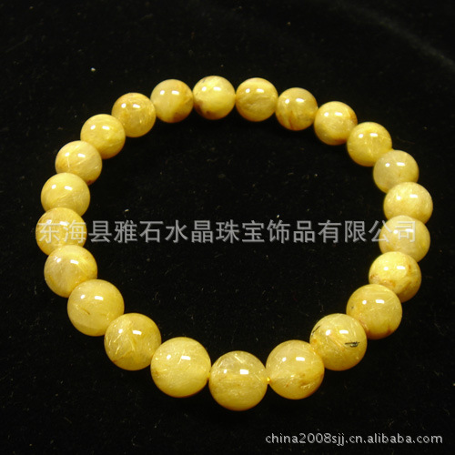 金发晶: 质地佳而少见的金发晶。极旺财运,加强自身气势,避邪化煞,有助于改善肠胃、肝胆等病症,其能量比其它水晶更为强大。 金发晶又有人称为维纳斯发晶,因为其金色的发晶酷似维纳斯一头柔软的金发而得名。是一种权威水晶,极具权势象征,因为它的气场能量极强,除了能辟邪外,还可可增强人体生物气场,增加胆识,实为进取心强烈,期望做大事者不可缺少的开运宝石。金发晶被认为能招财聚气. 正财偏财都招,磁场特强。