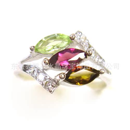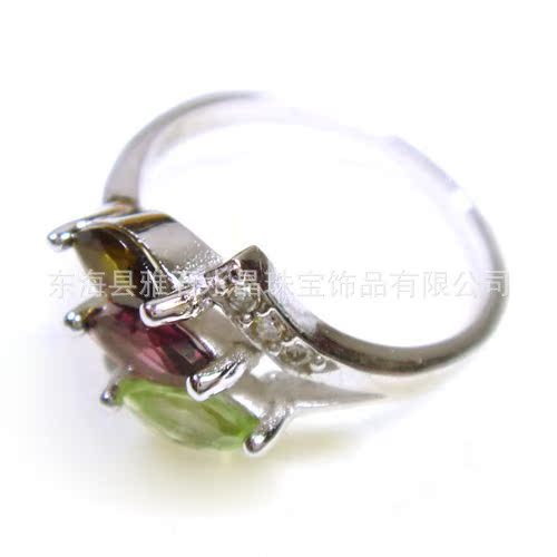 【名称】 925银镀白金天然彩色镶钻碧玺‘3粒珠’戒指