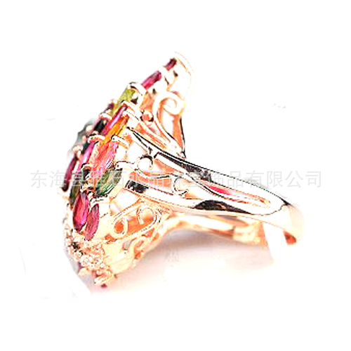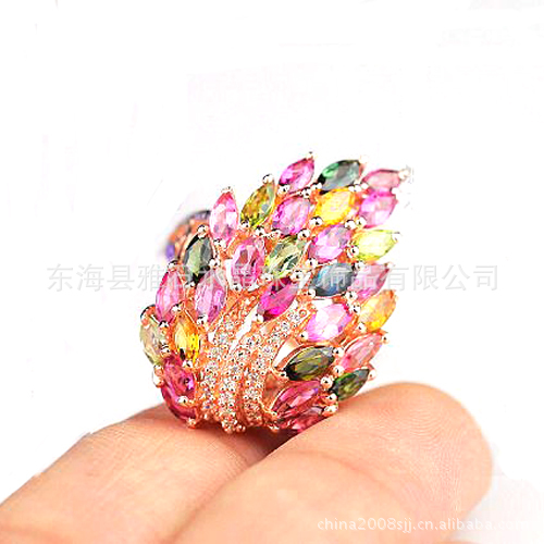 【名称】925银镀玫瑰金镶嵌水钻天然碧玺凤尾戒指