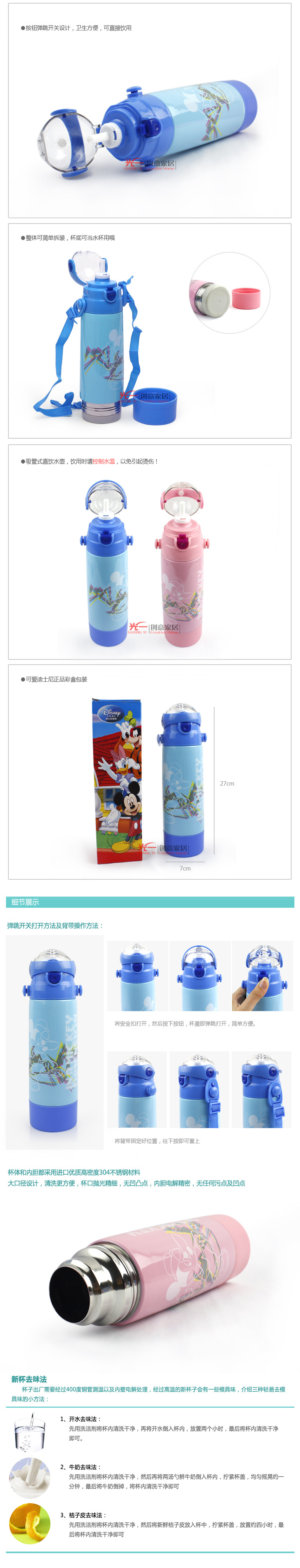 说明:弹跳开关,双背带,特别适合旅行,郊游途中带水喝,保冷保热,就是说你爬山的时候带的冷水很长时间也不会变热,炎热的夏天能喝到冰爽的水是最解渴的。里面有吸管,在运动过程中容易呼吸急促,带吸管喝水非常安全。