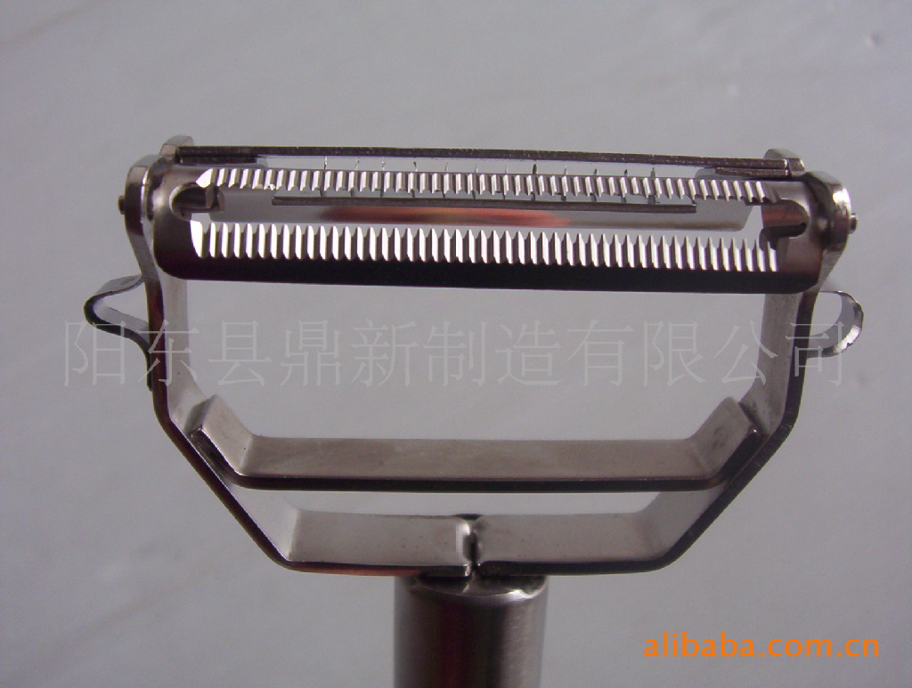 此产品有双刨刀片,一边用于刨丝,一边用于削皮。轻巧耐用,用途广泛,是厨房不可缺少的好帮手!刀片如下图: