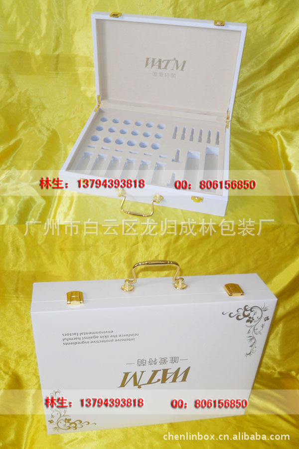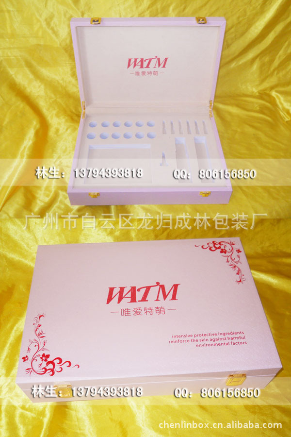 保健品木盒/保健品盒/化妆品木盒/充皮纸木盒。材料用9MM厚木板裱仿皮充皮纸,内托EVA贴米黄色绒布,盖子上面中间有垫海棉。再装金色五金精致加工而成。。也可以按客人要求订做尺寸大小材料和工艺,欢迎咨询。。林生:13794393818