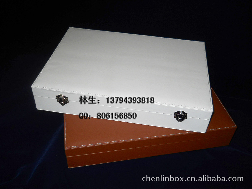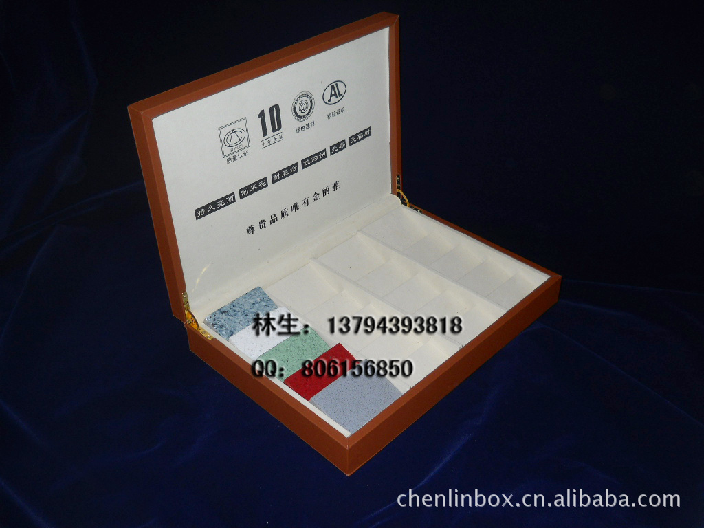 PU皮盒/皮包木盒/石英石样品盒,材料用PU皮革和9MM密度板加工精制而成,盒外皮革车线,正面可印LOGO,内斜放样块8*6*1.50CM,装20块,可按要求订做尺寸大小材料颜色工艺.欢迎咨询:林生:13794393818,QQ:806156850.