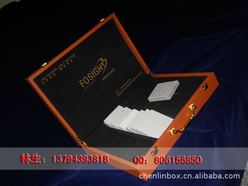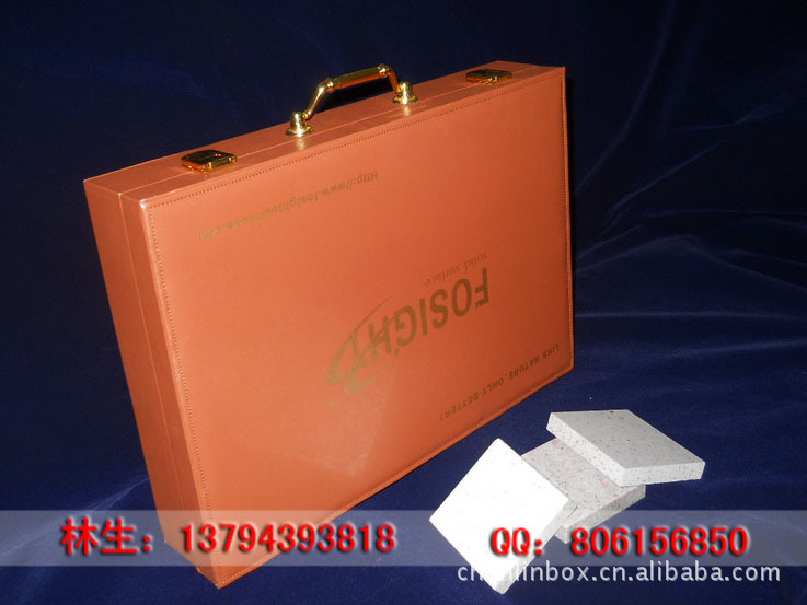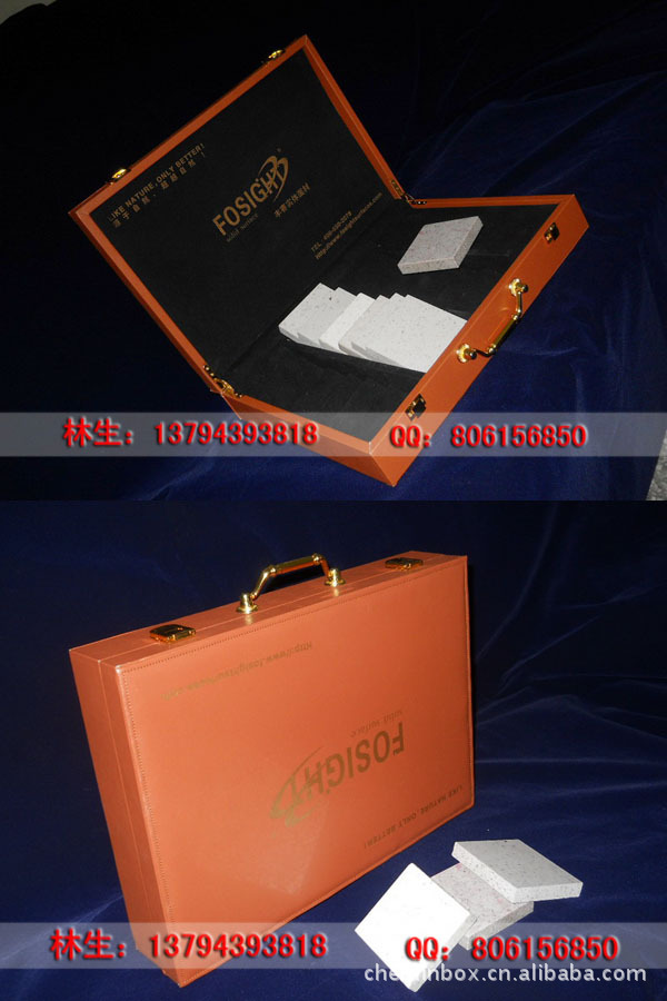 皮盒/皮包木盒/石英石色板盒/石英石样品盒/展示盒/色卡盒。内可装8*8*1.5色卡:24片装或20片装,也可按要求订做。。欢迎咨询林生:13794393818。