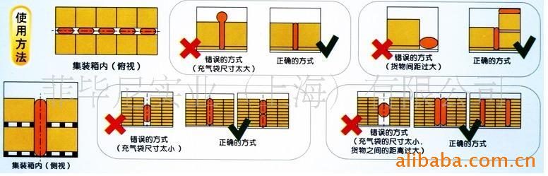 4.货物安全:在公路、铁路、海运过程中防止集装箱内、铁路车厢和卡车内的货物移动,高效并且经济实惠:充气袋相比于(熏蒸处理过的)木板和木条、环境污染的材料如聚苯乙烯泡沫来说是一种快速和高效的选择。