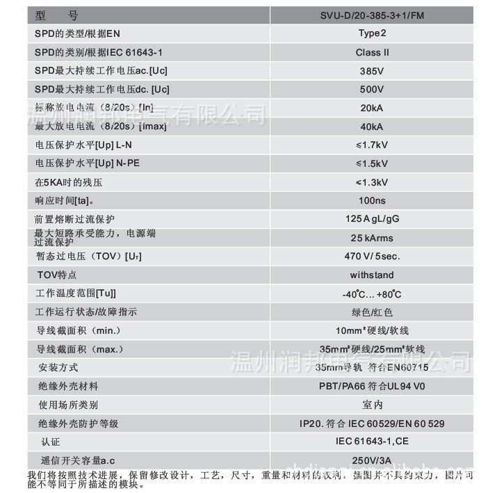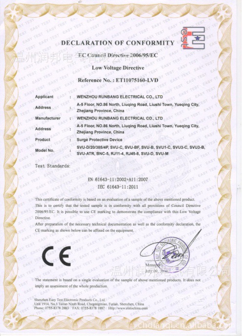 温州润邦电气有限公司是一家集研制.开发.生产销售为一体的防雷器.电涌保护器浪涌保护器公司.公司拥有全套的生产设备,检测设备和专业的技术人才.为防雷产品企业提供优质可靠的散件齐套。公司秉承“顾客至上,锐意进取”的经营理念,坚持“客户第一”的原则为广大客户提供优质的服务。欢迎广大客户惠顾!
