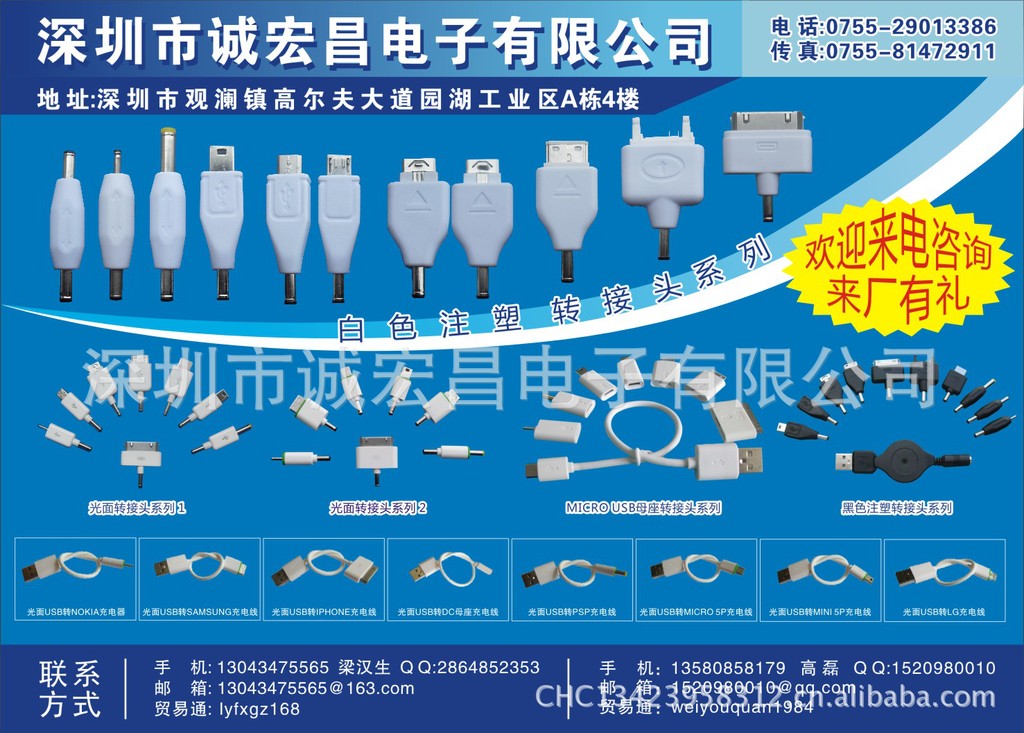 我公司为一般纳税人企业,主要生产电脑/手机/MP3/MP4/照相机/电脑打印机/充电器等数码周边的配件产品 主营产品:手机转接头、电脑转接头,连接器、连接线、数据线、伸缩线,音频视频线,车充,应急充电器、太阳能充电器、礼品系列、电源线、电源DC头、USB数据转接头充电转接头系列 品牌:诺基亚三星索爱西门子摩托罗拉LG 日本手机韩国通用插头IPOD 游戏机 数码笔记本转接头 国产手机 联想金立 TCL 都宝 南方高科 波导 夏新 康佳 金立 天阔 索爱 小灵通 各种耳机:MP3耳机/手机耳机/电脑耳机/CD耳机/多款金属耳机/各种伸缩线耳机等手机充电转接头:N8210/N70/A288/D800/E530/E720/T28/788/K750/C25/C55/V998/V66/V3 LG8080/LG510/LG6100/LG6000/LG-KG90/明基A31/明基-P50/酷派-728/IPOD/MP3充电系列/MP4充电系列/数码相机充电系列 手机应急充电转接线:N8210/N70/A288/A300/S600/D800/E530/E720/T28/788/K750/C25/C55/V998/V66/V3/T191LG8080/LG510/LG6100/LG6000/LG-KG90/明基A31/明基-P50/酷派-728/IPOD/MP3充电系列/MP4充电系列/数码相机充电系列 USB电脑连接线:AM TO AM /AF /BM /MINI-4P /MINI-5P /1394-4P /1394-6P /MINI-8P /MINI-10P 各种伸缩线产品:USB连接线/各种耳机/鼠标线/通讯数码产品充电连接线 DC头接口型号:2006、23507、2507、3011、3211、3511、35135、4017、47517、4817、5521、5525、6011、60135 手机接口型号:N8210/N70/N8600/A288/D800/M300/E818/V680/24P /S600/V998/V66/V3/V8/C25/C55/A31/T28/K750/LG6000/ KG90/VX8300/LG510 /AU/FOMA/DOCOMA/CDMA/PSP/任天堂NDS /GBA-SP 我司配套设备齐全,产品工艺流程成熟,各款型号应有尽有,在最短的时间内解决你的各种需求,产品质量追求O缺陷,服务直到你点头!质量是产品的生命,信誉是企业的灵魂,产品合格不是标准,用户满意才是目的!!!欢迎来电咨询,联系人:孟晓梅电话:13423958312 网址http://www.xgzchengmao.cn