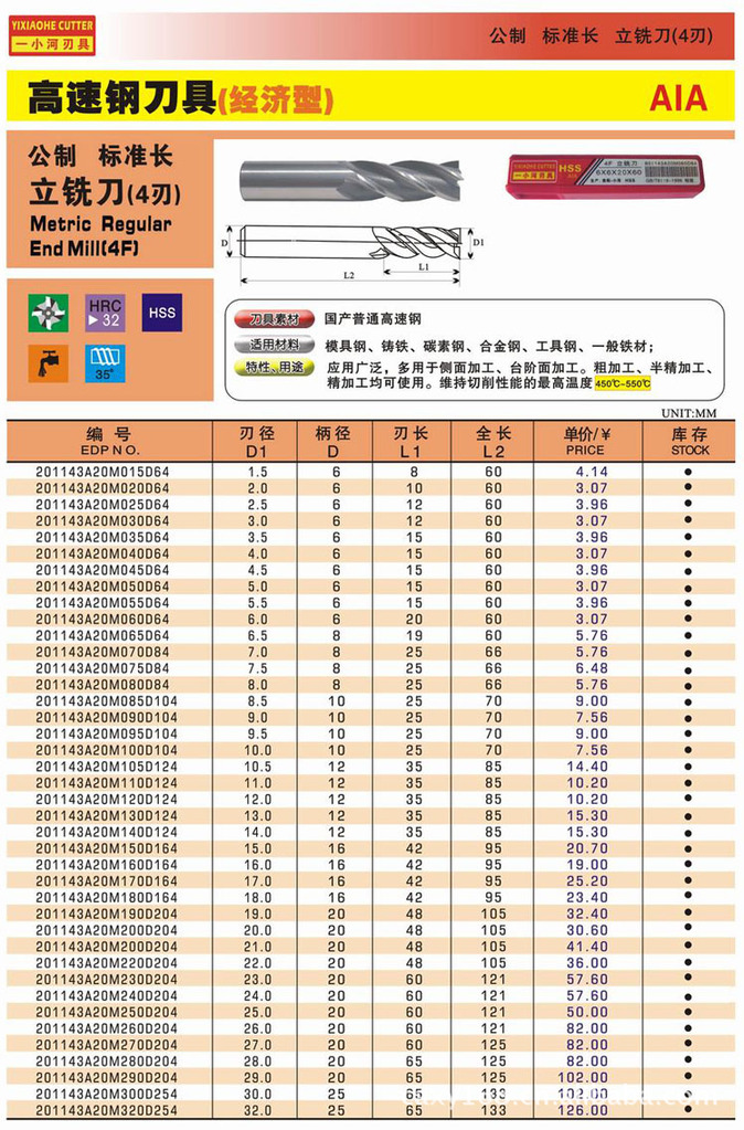注:以上是贵阳高速钢刀具Φ4.5~32普长 AIA 4刃立铣刀相关介绍及报价,假如贵司在此没找到适合的请点击更多.....