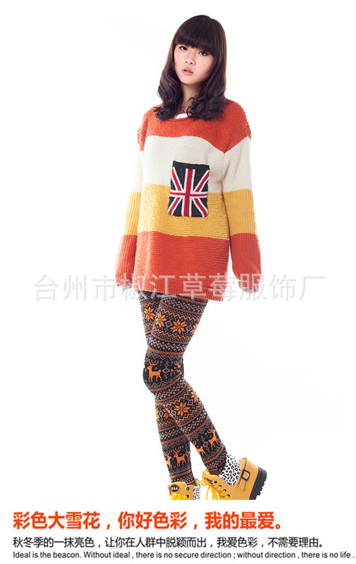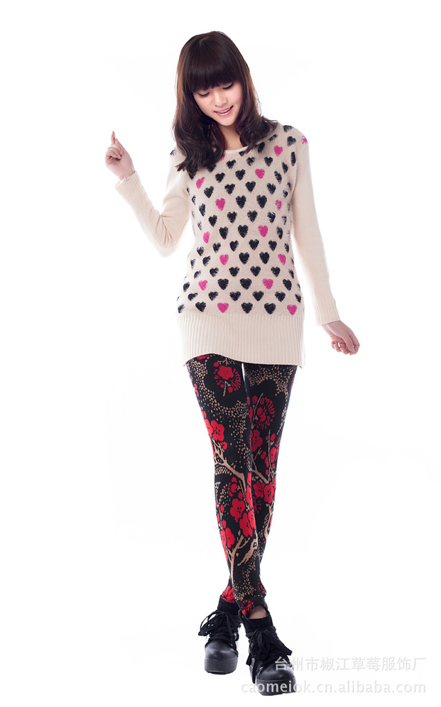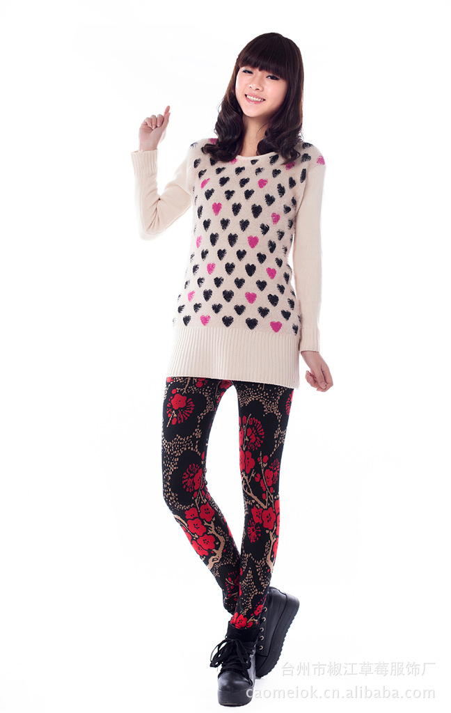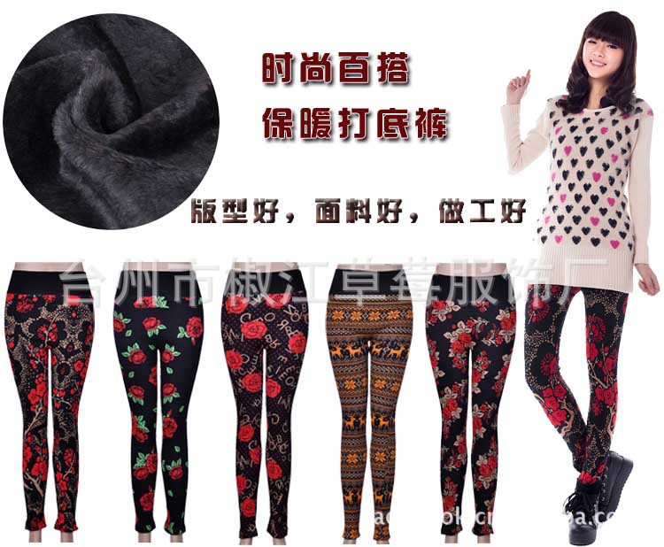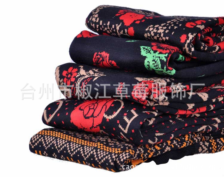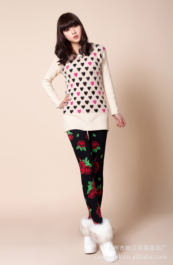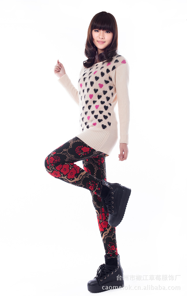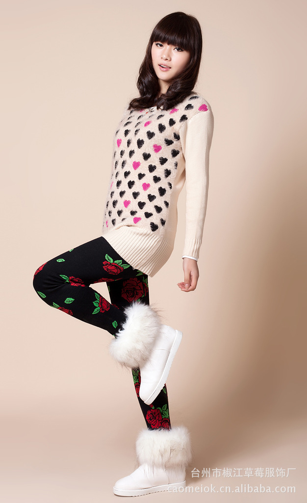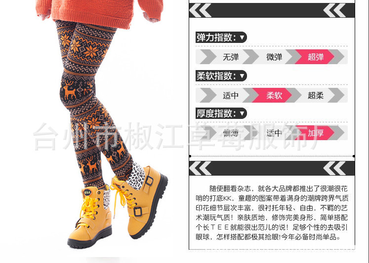 大花打底裤风潮正扑面而来,我们特别研发了这款机织的打底裤,以可爱的雪花小鹿,玫瑰,牡丹花等为图案,