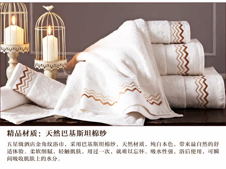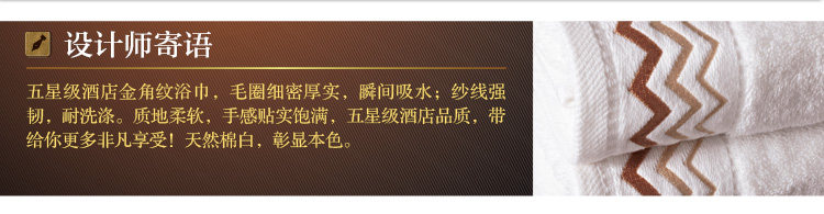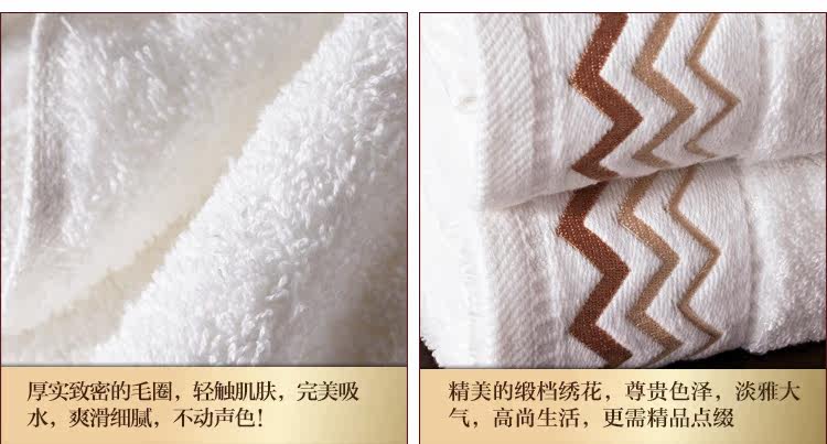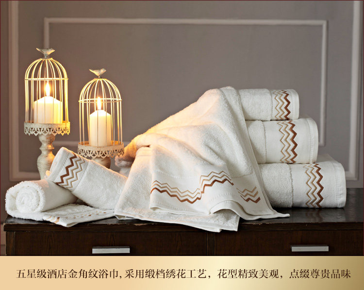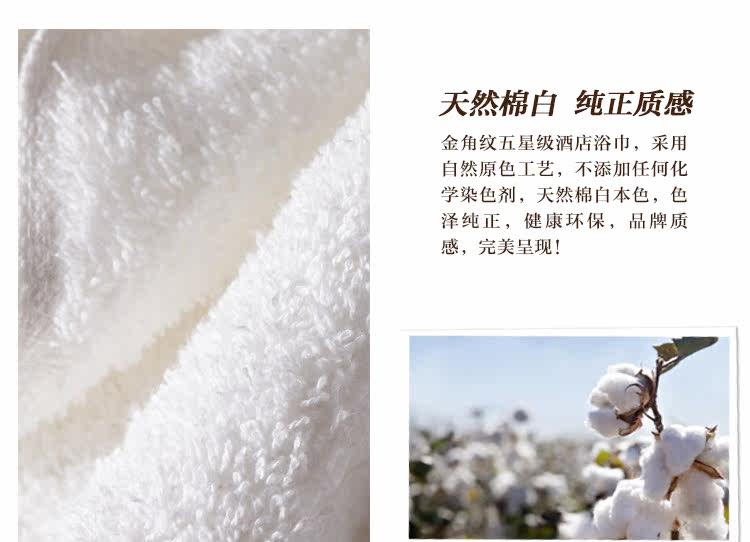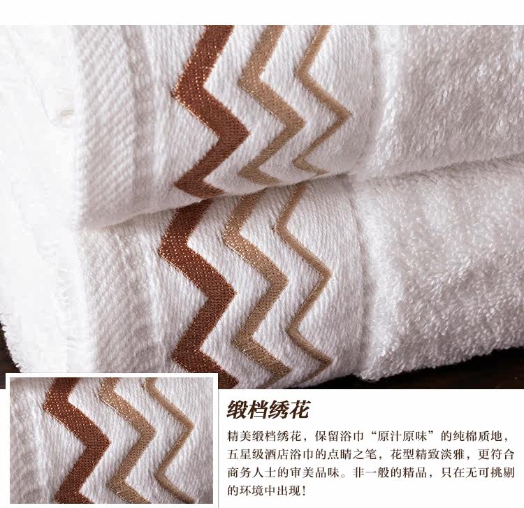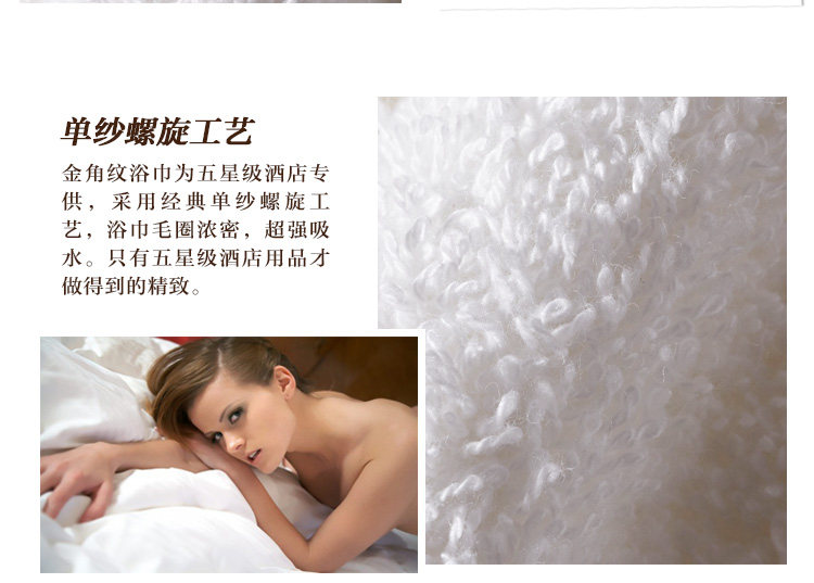 | 产品特点 | 1、采用自然原色工艺,不添加任何化学染色剂,天然棉白本色,色泽纯正,健康环保,品牌质感,完美呈现! 2、采用经典单纱螺旋工艺,浴巾毛圈浓密,超强吸水。只有五星级酒店用品才做得到的精致。 3、五星级酒店浴巾的点睛之笔,花型精致淡雅,更符合商务人士的审美品味。 |