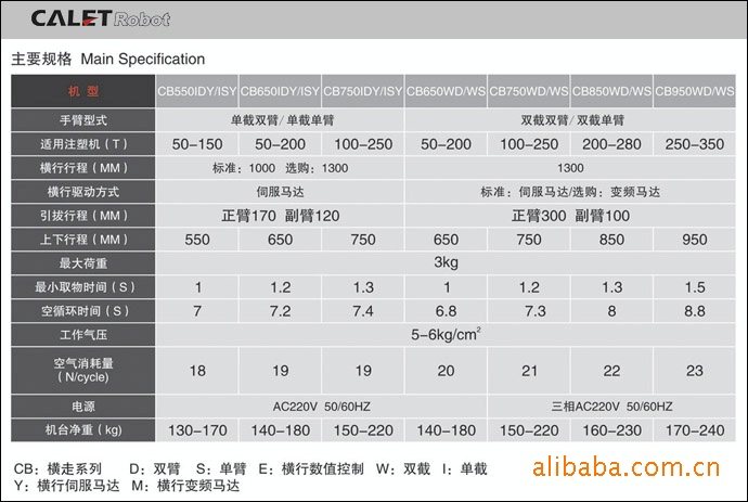 CB-750WDY双截双臂机械手适用于50~400吨的各型卧式注塑机成品及料头的自动取出。可以具有单臂或双臂的配置,可以用于三板模同时夹取成品和料头,驱动方式为气压驱动。安装此机械手臂可以增加产能20~30%,降低产品的不合格率,减少浪费,降低材料和人工成本。