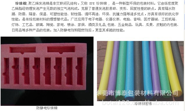 广泛应用于电子电器、仪器仪表、电脑、音响、医疗器械、工控机箱、灯饰、工艺品、玻璃、陶瓷、家电、喷涂、家俱、酒类及礼品包装、五金制品、玩具、瓜果、皮鞋的内包装、日用品等多种产品的包装。加入防静电剂和阻燃剂后,更显其卓越的性能. EPE 珍珠棉还被大量用于手袋箱包的弹性衬里,工业生产的隔音、隔热材料、农用保温材料、水产养殖的漂浮设备、体育用品的防护垫,水上作业救生器材,家庭、宾馆的地板装修、衬垫等等。其管材大量用于空调、童车、儿童玩具、家私等行业。 EPE 和各种织物的粘合制品是各种车辆和居室的良好内装修材料。 EPE 和铝箔或镀铝薄膜的复合制品具有优异的反红外线紫外线能力,是一些化工设备冷藏库和野营器材汽车遮阳的代用品。