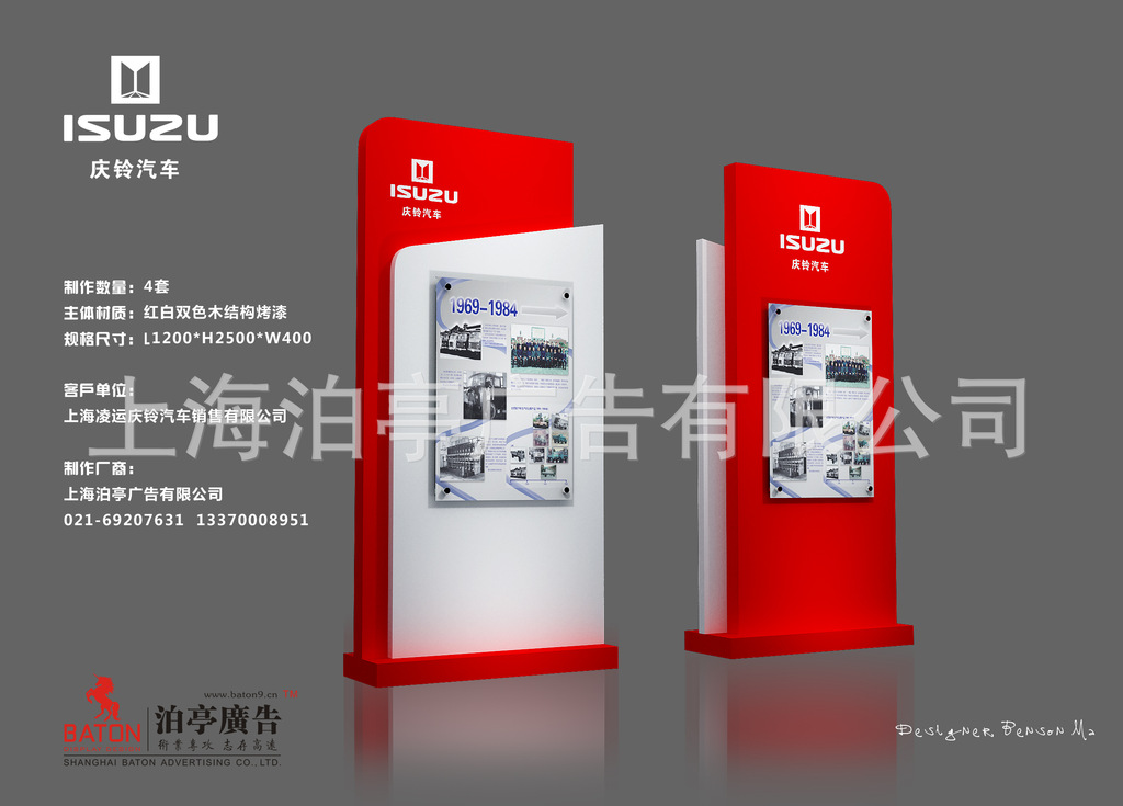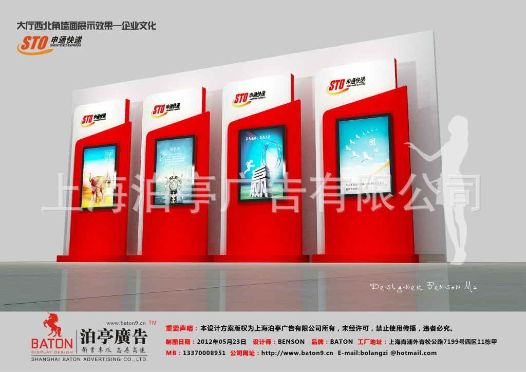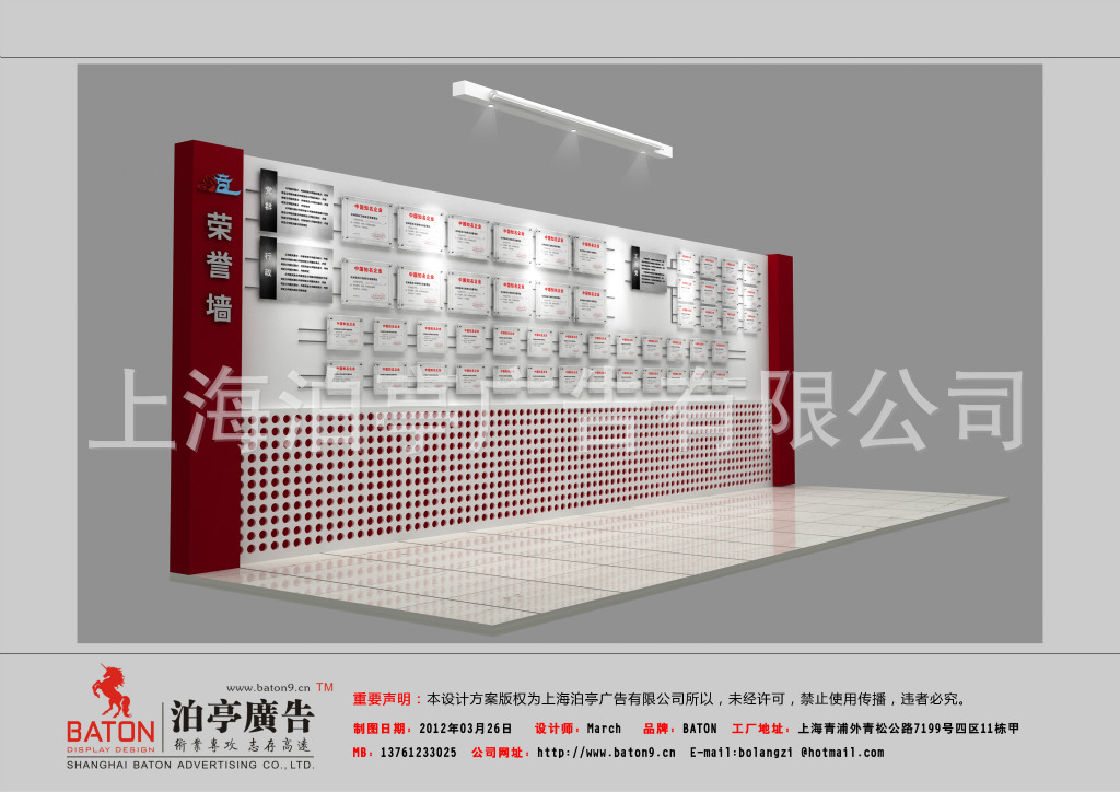 上海泊亭广告有限公司【BATON】成立于2008年,注册资金100万元,是专业从事展览设计搭建、活动策划及执行、商场道具制作、专卖店装修、企业形象及品牌形象设计制作的设计加工一体化实力企业,厂房占地3000平方,总部位于上海市青浦区外青松公路7199号4区11栋甲,有办公楼、独立木工车间、油漆喷房、铁工车间、储备仓库、桁架及钢铝型材仓库,技术厂长具备15年以上施工操作经验,工程部设计师均来自专业广州、上海美术院校广告设计专业,本科以上人才6名,并在北京海淀区设有分公司办公室,朝阳区有分工厂,,可为各行业有需求的客户提供全国范围内的创意设计、生产加工、上门安装一条龙服务。我们企业口号是:“细节决定成败,诚信共赢天下”,旨在营造一个“高质量、低价格、优细节、重信誉”的经商理念。