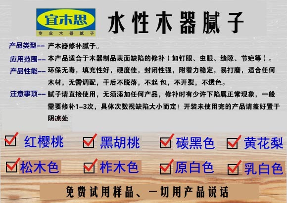 【宜木思】牌腻子是一种多功能的环保水性填料,它是公司结合了木材的本身特性、各种有机无机原料和天然材料的特点及当今用户的要求而开发出来的新一代环保水性腻子,它集填孔补洞、填缝补节、木眼填平和封边饰面等用途于一身,是家具、地板、门窗、楼梯、工艺品等木制品底面处理的理想产品。该产品从原料选材到生产工艺都没有任何有毒成分,是一种真正的环保水性腻子。