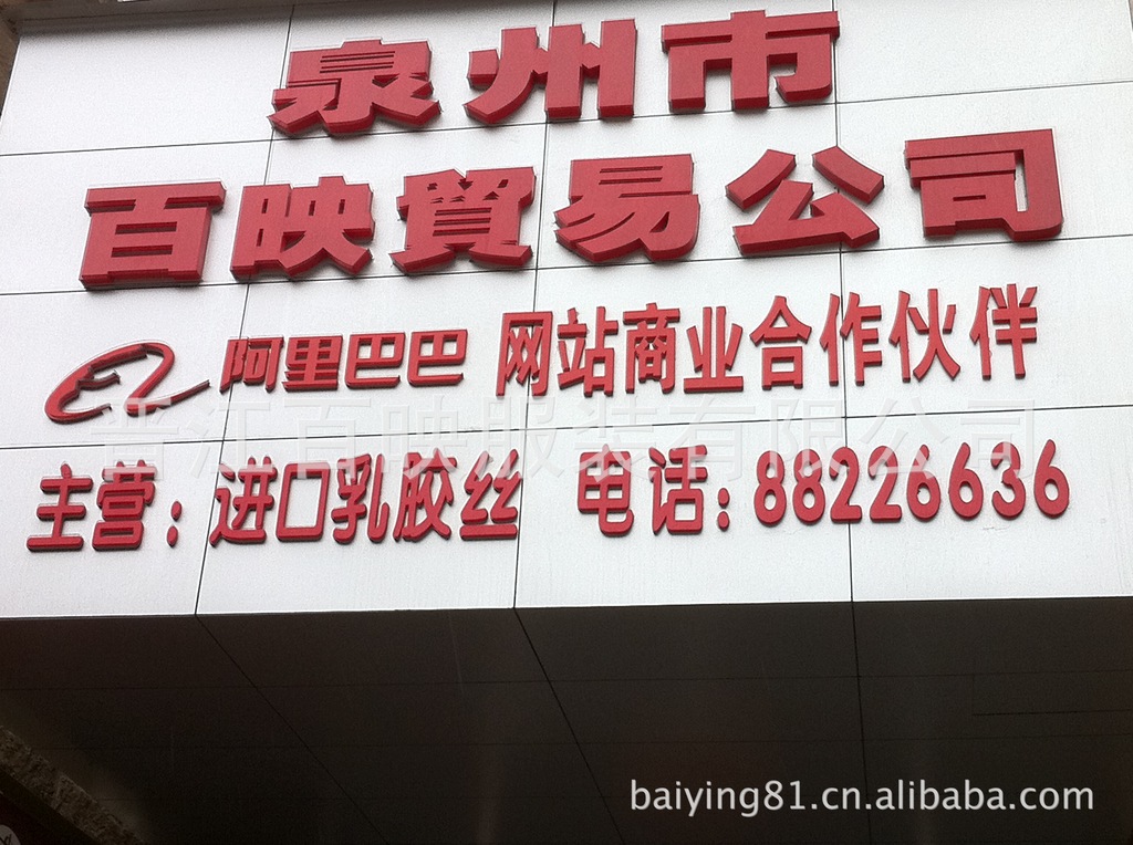 晋江百映服装有限公司,主要进口及批发零售泰国,马来西亚等国优质乳胶丝,广泛用于钩编,无梭,袜,绳带等高档弹性织物系列上.标准有40条一组,颜色有黑白两种,型号:23至100主要以23#28#32#37#42#52#63#90#100#等,公司本 顾客至上,信誉第一 的经营宗旨,力求以热诚的服务,稳定的货源,优惠的价格服务于新老客户,欢迎各地厂商来电洽谈