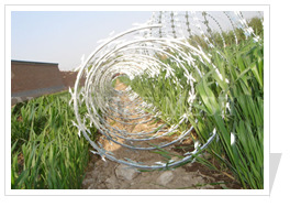 螺旋型交叉刀片刺网系在两条刀片刺网之间,以不锈钢片和镀锌片强力夹扣,展开后即呈交叉状,即美观又实用。