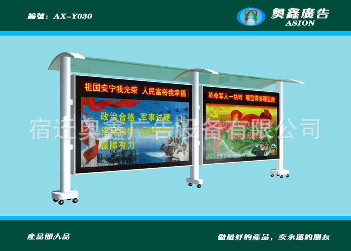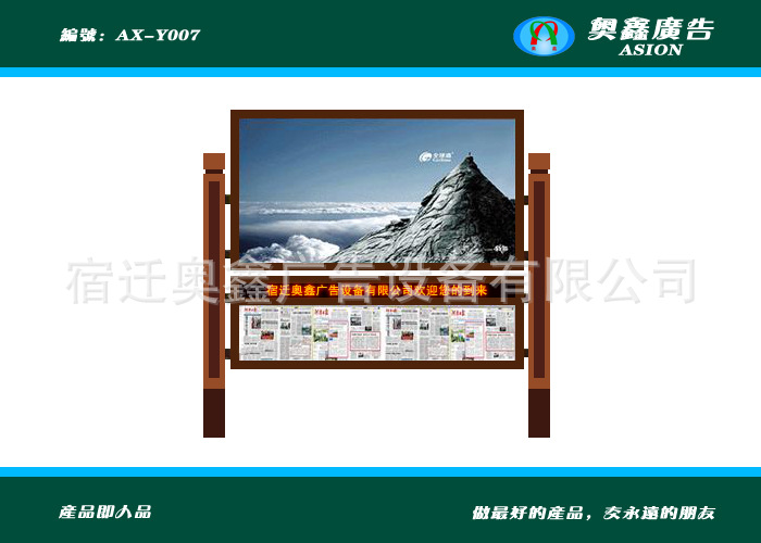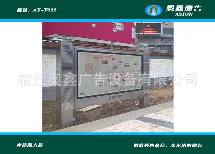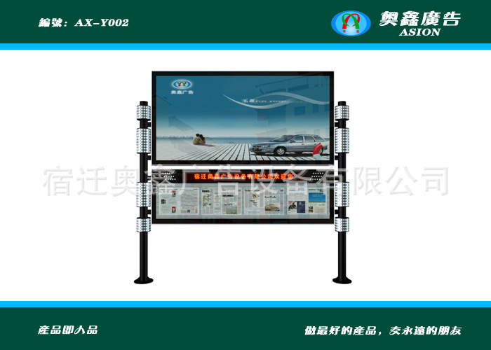 公司以“诚信为本、质量第一、客户第一”为原则,以一流的产品引导市场,与国内众多广告公司、政府单位建立了稳定的业务合作关系,得到了客户的一致好评,江苏奥鑫广告设备有限公司热诚欢迎您前来我公司参观、洽谈合作。 欢迎来电预约公司2011版产品图册,咨询电话:0527-80865888或18936956011。