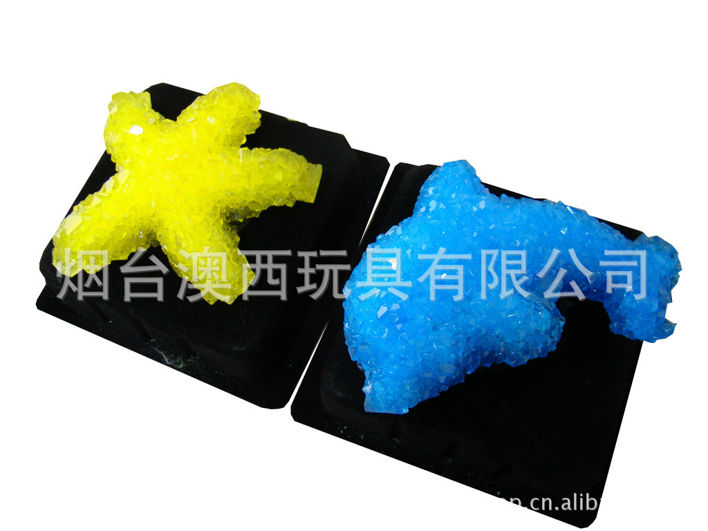 晶体生长DIY系列是基于过饱和溶液结晶的晶体生长科学原理开发的科学玩具产品。从中可以学习到晶体生长的科学知识,感受科学的神奇魅力,提高科学研究能力和动手能力,更重要的是给人们提供探索、实践、创造和解决问题的机会。由于晶体是在非严格受控状态下自由生长的,最后长出的晶体将是奇妙而绚烂的,堪称科学艺术的结晶。期待着你亲手制作的“红宝石”、绿宝石”、“蓝宝石”、“黄水晶”、“紫水晶”“钻石” “可爱炫目的小海星和小海豚” “多彩心情” ,拿给大家欣赏吧!