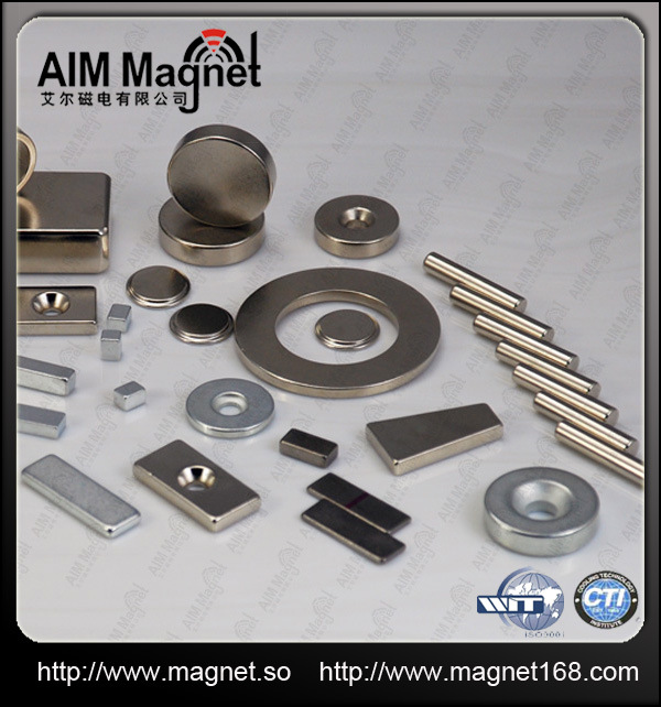 Neodymium magnet)也称为钕铁硼磁铁,其化学式为Nd2Fe14B,是一种人造的永久磁铁,目前为止具有最强磁力的永久磁铁。 被人们称为磁王,拥有极高的磁性能其最大磁能积(BHmax)高过铁氧体(Ferrite)10倍以上。其本身的机械加工性能亦相当之好。工作温度最高可达200摄氏度。而且其质地坚硬,性能稳定,有很好的性价比,故其应用极其广泛。但因为其化学活性很强,所以必须对其表面凃层处理。(如镀Zn,Ni,电泳、钝化等)。 钕磁铁是住友特殊金属公司的佐川真人等人于1982年发明的,由其化学式可知其主要由钕、铁与硼等化学元素所构成。在许多领域有可能取代传统的纯铁磁铁, 铝镍钴合金和钐钴磁铁譬如电动机, 仪器和仪表,汽车工业, 石油化工产业和磁性医疗保健产品。能生产各种形状的:譬如圆盘磁铁,圆环磁铁, 长方形磁铁, 弧磁铁和其它形状的磁铁。 具有强力磁性的钕磁铁被广泛被应用在电子产品上,例如硬盘、手机、耳机等等。