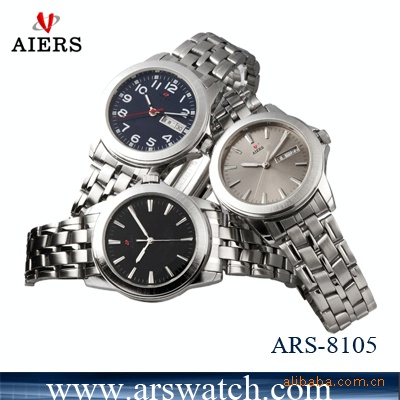 材质:304L不锈钢表壳、304L不锈钢表带、日本进口单日历石英机芯。