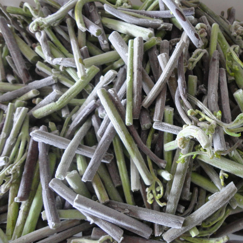 蕨菜又叫拳头菜、猫爪、龙头菜。蕨菜野生在林间、山野、松林内,是无任何污染的绿色野菜,不但富含人体需要的多种维生素,还有清肠健胃,舒筋活络等功效。蕨菜食用前经沸水烫后,再浸入凉水中除去异味,便可食用。经处理的蕨菜口感清香滑润,再拌以佐料,清凉爽口,是难得的上乘酒菜。
