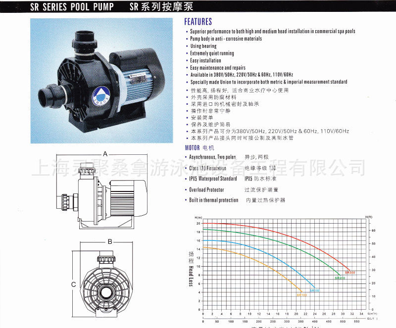 性能佳,扬程高,适合在商业水疗中心使用外壳采用防腐材料采用进口的机械密封及轴承操作时十分宁静保养及维护简单本系列产品可分为380V/50HZ,220V/50HZ,110V/60HZ