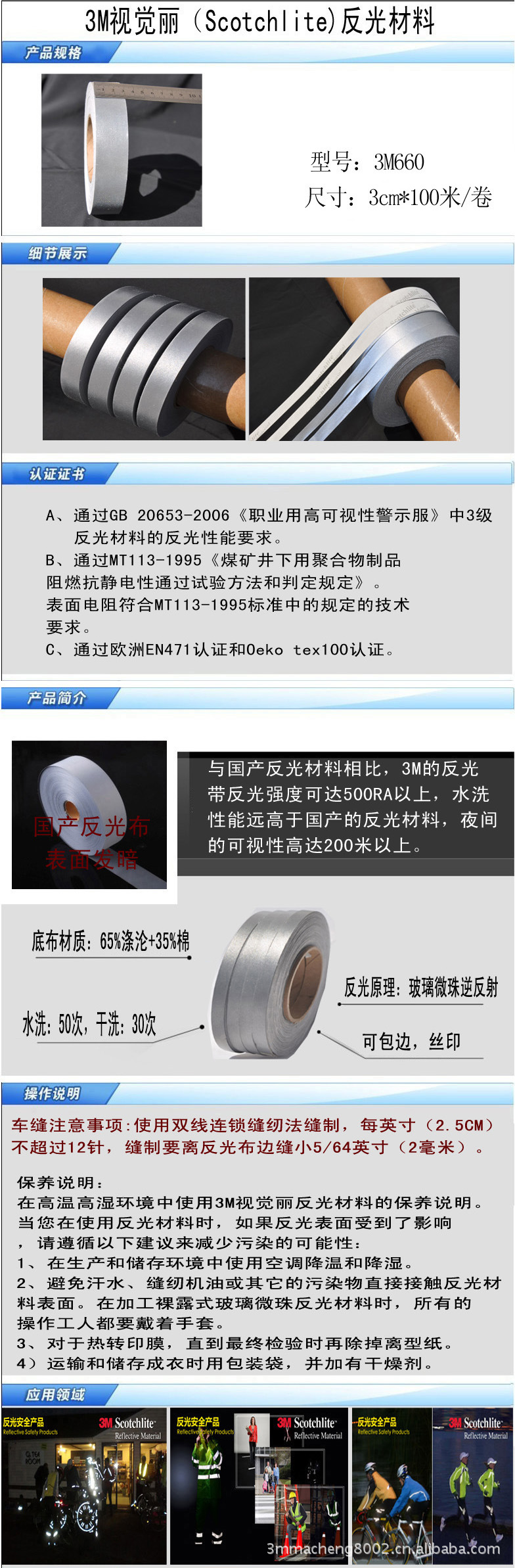 ■■■公司介绍 无锡市马成服装辅料有限公司是3M公司正规授权的经销商,所经销(批发)的3M反光材料、3M反光布、3M反光带、3M反光条、3M反光热贴膜等反光产品,畅销消费者市场,在消费者当中享有较高的地位,是品牌产品企业的首选和用品,公司与国内外知名品牌企业、零售商、3M经销商(3M代理商)建立了长期合作的稳定关系。 无锡市马成服装辅料有限公司经营的视觉丽反光材料(Scotchlite反光材料),以多品种经营特色和薄利多销的原则,以“用人品做产品,诚信是最低标准”的公司理念,赢得了知名品牌公司和广大消费者的信赖和支持。 正品防伪查询: 进入3M官网www.3m.com.cn点击相关连接中的3M合作伙伴授权证书查询 输入授权证书的证书编号(dnjH4X2012EP021)可以查到本公司的授权资料。 (授权证书每年会更新,由于业务繁忙客服来不及更新,需要最新版本授权证书,请与客服联系或致电0510-83706170) ■■■产品介绍