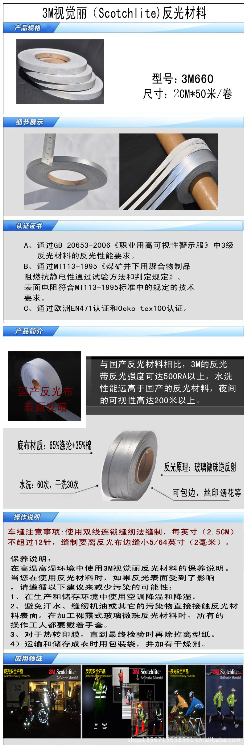 ■■■公司介绍 无锡市马成服装辅料有限公司是3M公司正规授权的经销商,所经销(批发)的3M反光材料、3M反光布、3M反光带、3M反光条、3M反光热贴膜等反光产品,畅销消费者市场,在消费者当中享有较高的地位,是品牌产品企业的首选和用品,公司与国内外知名品牌企业、零售商、3M经销商(3M代理商)建立了长期合作的稳定关系。 无锡市马成服装辅料有限公司经营的视觉丽反光材料(Scotchlite反光材料),以多品种经营特色和薄利多销的原则,以“用人品做产品,诚信是最低标准”的公司理念,赢得了知名品牌公司和广大消费者的信赖和支持。 正品防伪查询: 进入3M官网www.3m.com.cn点击相关连接中的3M合作伙伴授权证书查询 输入授权证书的证书编号(dnjH4X2012EP021)可以查到本公司的授权资料。 (授权证书每年会更新,由于业务繁忙客服来不及更新,需要最新版本授权证书,请与客服联系或致电0510-83706170) ■■■产品介绍