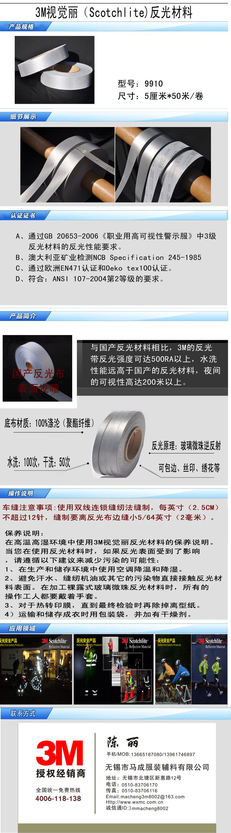 ■■■公司介绍 无锡市马成服装辅料有限公司是3M公司正规授权的经销商,所经销(批发)的3M反光材料、3M反光布、3M反光带、3M反光条、3M反光热贴膜等反光产品,畅销消费者市场,在消费者当中享有较高的地位,是品牌产品企业的首选和用品,公司与国内外知名品牌企业、零售商、3M经销商(3M代理商)建立了长期合作的稳定关系。 无锡市马成服装辅料有限公司经营的视觉丽反光材料(Scotchlite反光材料),以多品种经营特色和薄利多销的原则,以“用人品做产品,诚信是最低标准”的公司理念,赢得了知名品牌公司和广大消费者的信赖和支持。 正品防伪查询: 进入3M官网www.3m.com.cn点击相关连接中的3M合作伙伴授权证书查询 输入授权证书的证书编号(dnjH4X2012EP021)可以查到本公司的授权资料。 (授权证书每年会更新,由于业务繁忙客服来不及更新,需要最新版本授权证书,请与客服联系或致电0510-83706170) ■■■产品介绍