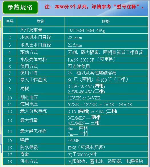 备注:以上参数仅供参考,,水陆两用陆用时请先让水自然流进泵体流道内,否则泵无法泵水工作。 “G”表示耐高温水泵,“GT”表示耐高温并可调速水泵,电流值≤2000mA水泵耐温只能≤60°。 如有其他参数要求请直接与我公司联系!