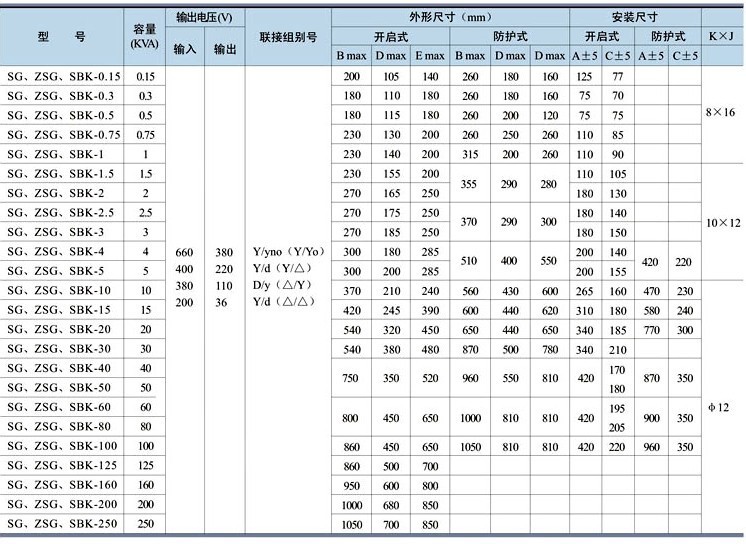 本公司多年来优质材料和先进的工艺专业生产160VA至600KVA之间,SBK系列三相干式变压器是本公司参照西门子公司同类产品最新研制开发数控系统专用变压器,采用优质冷轧硅钢片叠装,特殊浸漆工艺处理,有效降低了运行时的震动和噪声,以及采用耐高温的绝缘材料设计等新工艺、新技术的引入,使变压器更加节能、性能更加稳定。产品的各种输入、输出的电压高低、联接组别、调节抽头的多少及位置、绕组容量的分配、次级单相的配备,均可根据用户的要求进行精心的设计与制造。 与西门子4AP系列通用,产品符合VDE0550、IEC439、JB5555、GB226等国标、国家标准。