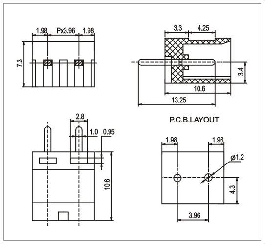 Pitch:3.96mm材质及电镀焊针:黄铜, 镀锡塑件:PA66, UL94V-0电气性能额定电压:300V额定电流:15A接触电阻:20m?绝缘电阻:5000M?/1000V耐电压:AC1500V/1Min机械性能温度范围:-40oC~+130oC瞬时温度:+250oC 5秒