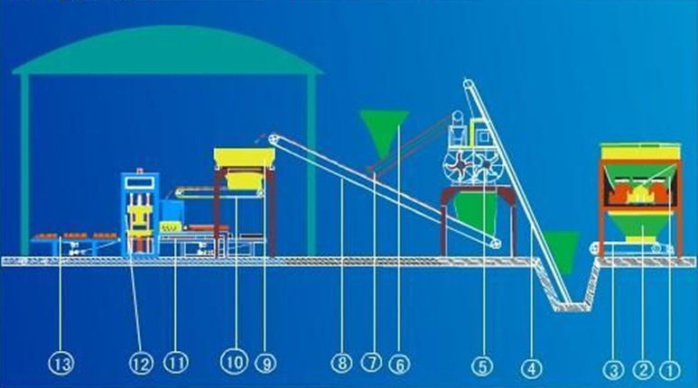 液压免烧砖机系统主要设备有配料机、搅拌机、成型机、升板系统、子车系统、母车系统、降板及码垛系统等。