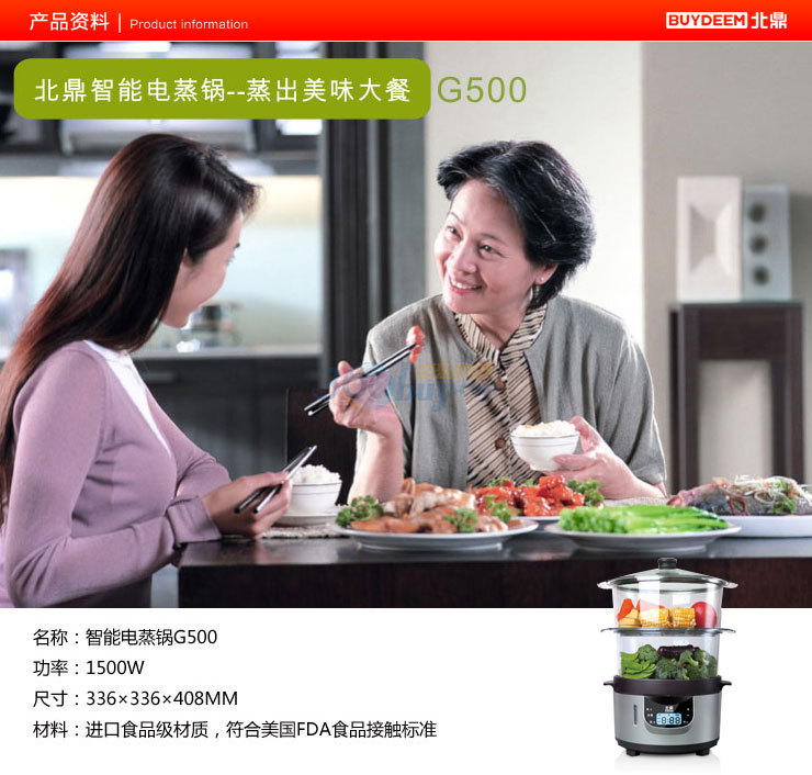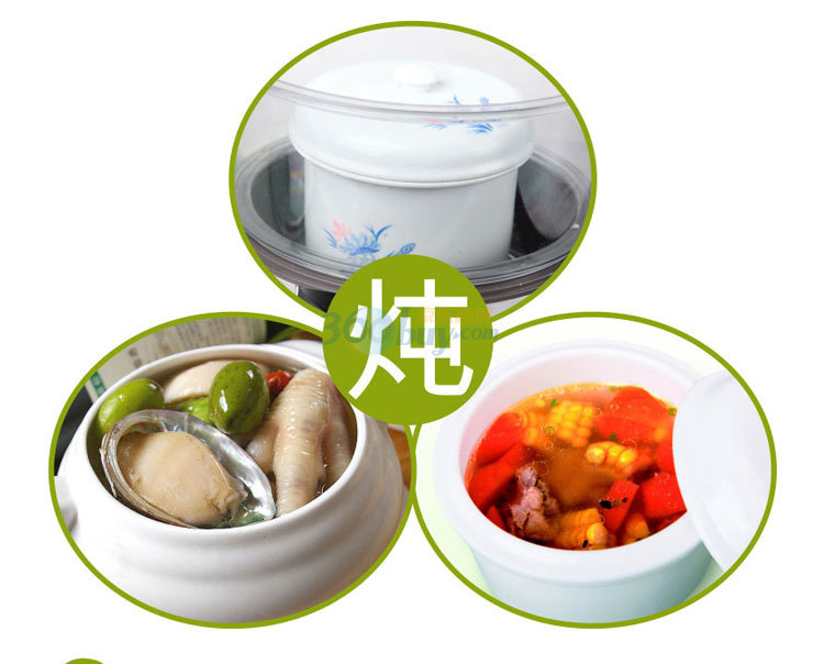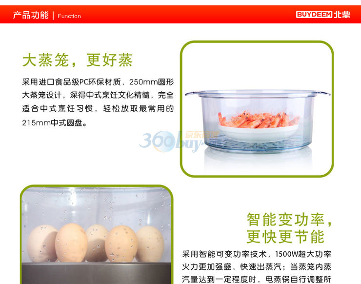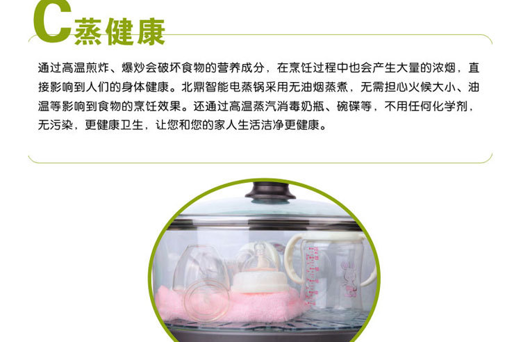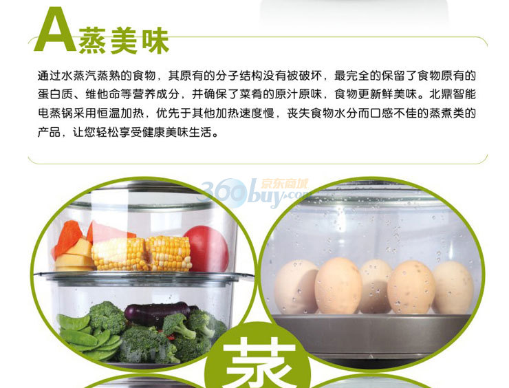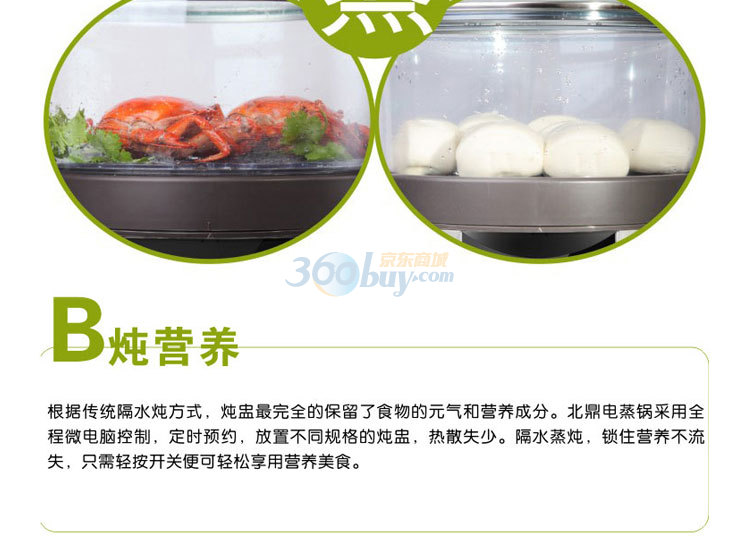 1、进口食品级环保材质,符合美国FDA食品接触标准2、智能变频,节能罩中央集热,更快更节能3、蒸、炖、消毒功能4、圆形大蒸笼设计,可拆卸蒸隔板(带蒸蛋孔设计),适合各种碗碟、炖盅5、低水量自动报警,无水自动断电6、隐藏式外注水口,方便随时加水7、LCD触控显示面板,防水耐用8、蒸笼嵌套叠合储藏,便于收纳9、定时响铃提醒10、电源线隐藏式收纳
